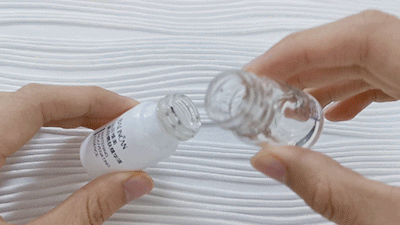 再将“修复弹”倒进“打斑弹”中,轻轻摇晃3秒,精华液就会完成融合,祛斑+修复整整溶在一起啦!