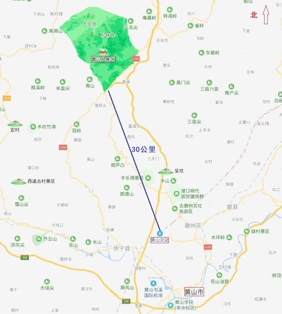 黄山北站其实在黄山风景区以南(来源:百度地图修改)