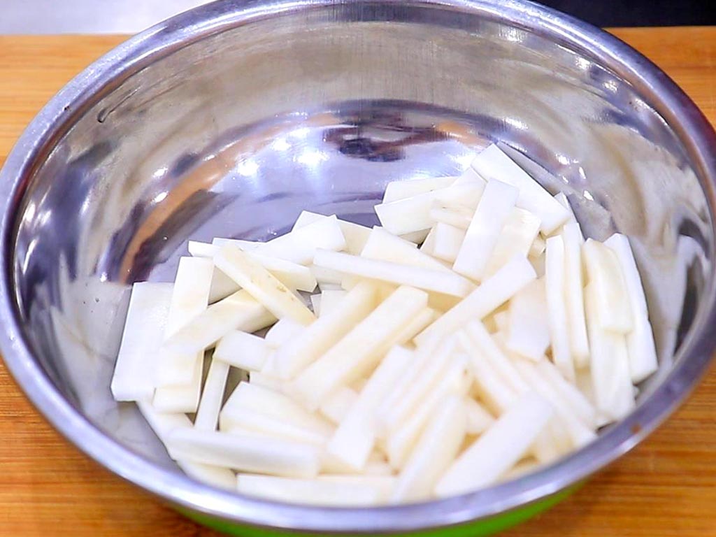 1.将一根白萝卜洗干净后切成段,然后一边滚动一边切,把萝卜皮片下来,再修平整一些,然后把修整好的萝卜皮切成均匀宽条放入盆中,加入食盐用手抓匀腌制30分钟,杀出萝卜中的苦水,同时去除辛辣味。