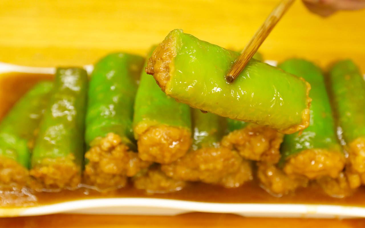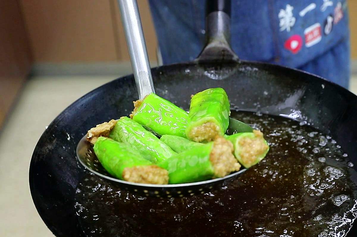 4.锅烧宽油,油温大概四成的时候。把青椒酿肉放进去,小火慢慢地炸。青椒表面鼓小泡的时候,就管捞出来了。这一步主要是为了定型。