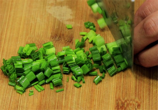 1.小葱一把切成葱花,小米椒切成辣椒圈;大蒜几粒放在蒜臼子里捣成蒜泥,挖出来放在盆中。