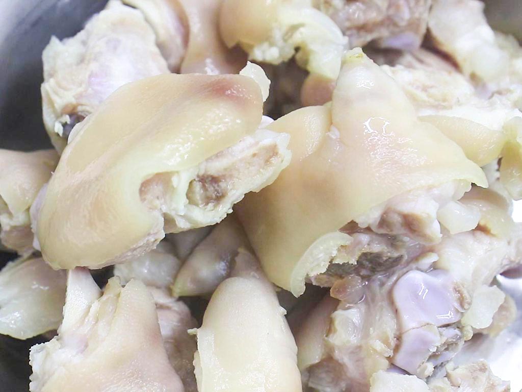 1.准备适量的干花生用温水浸泡一个小时,浸泡后要去除去花生的红衣;然后将两个猪蹄先用喷枪烤一下,去除皮腥味和残余猪毛,烤好(或煎好)以后刮去焦黑的地方,用清水洗净后剁成小块儿。
