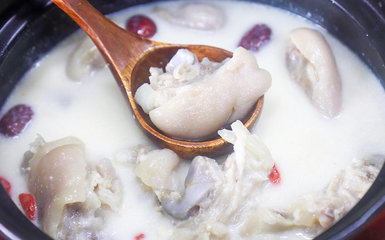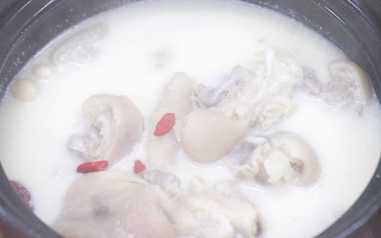 3.锅中加入清水放入猪蹄,通电以后开大火炖煮30分钟,炖煮期间猪蹄中的油脂会溢出来,不喜欢太油腻的可以用勺子打去浮沫。30分钟以后倒入花生转小火炖煮,花生是提前泡好的差不多炖10分钟就可以了,猪蹄大概八成熟的时候转微小火,盖上锅盖焖一会,千滚不如一焖,焖制的时候既不乱汤还能析出更多的营养。