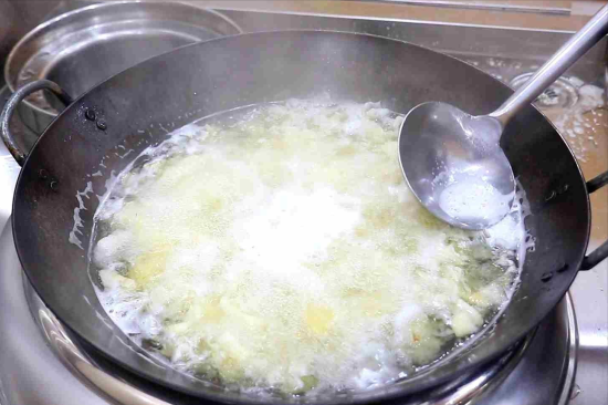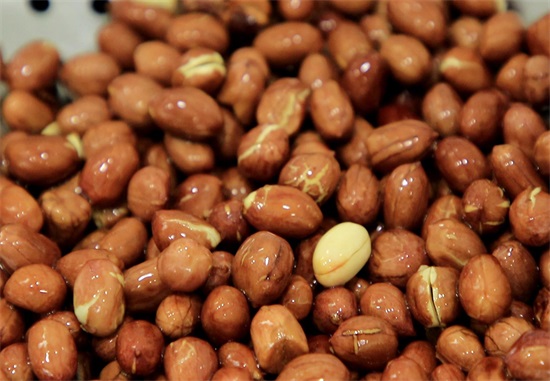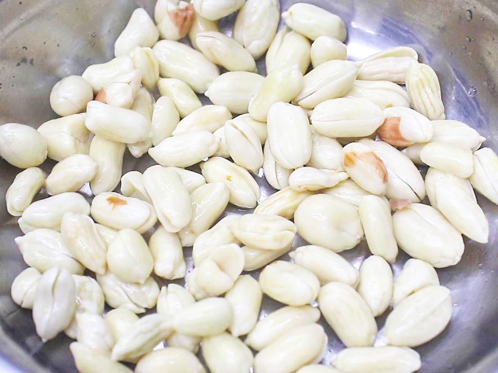 2.锅内烧油,凉油下入花生米用勺子不停地推动,炸花生米时要注意,不要等到花生米变色,花生米一旦变色捞出来就已经炸老了,凉油放入花生米,听到十多声噼啪声,花生米就要捞出来,放在一边晾凉。