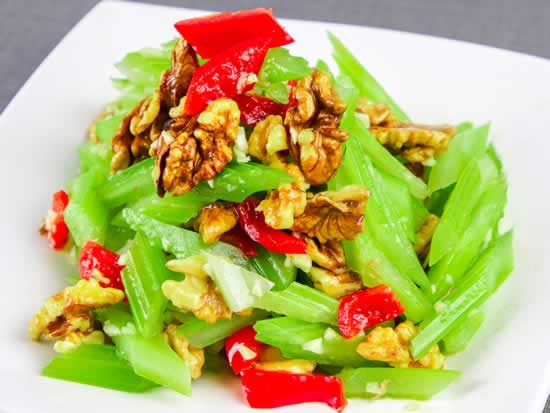 3.准备一个大盆,倒入切好的蒜末,加入食盐2克、味精1克、白糖少许提鲜、白醋3克、香油5克,把控干水分的芹菜和红椒倒入盆中颠盆拌匀,倒入核桃仁,再次拌匀后即可装盘。