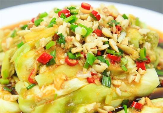 5.蒜泥中倒入味极鲜3克,香醋3克,生抽5克,芝麻香油3克,辣椒油3克,放入辣椒圈和小葱花,搅拌好以后均匀地淋在茄子上面,再撒上花生碎即可,这道简单好吃的口味茄条就做好了。