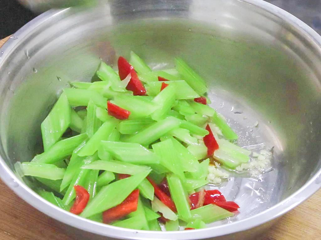 2.锅内加入适量清水,加入少许食盐和植物油,水烧开后倒入切好的芹菜和红椒,焯水1分钟左右,芹菜断生后捞出,用清水冲洗冷却备用,清水冲洗能使芹菜口感更脆。