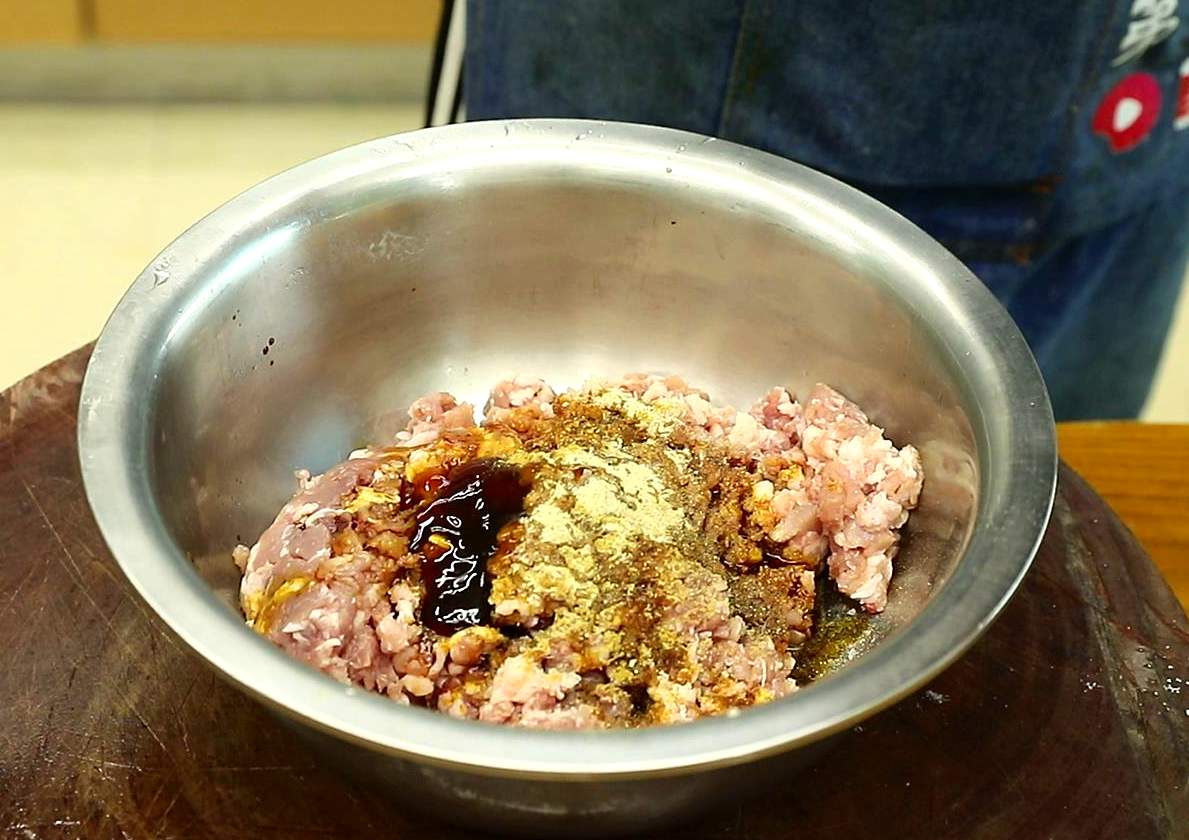 1.一块肥瘦相间的五花肉剁成馅,加入盐、白糖、胡椒粉、十三香、生抽、蚝油、料酒,再打入一个鸡蛋把肉馅打上劲。