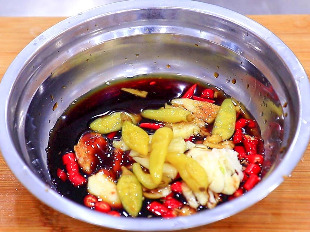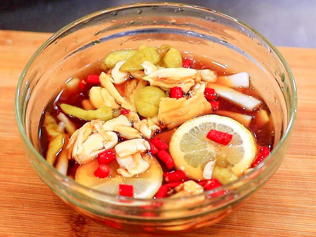 2.准备腌料:小米椒切成圈;大蒜拍扁;生姜也拍扁放在一起,加入鸡精2克、白糖15克、陈醋10克、生抽10克、蚝油5克增鲜,再放入适量的野山椒水和野山椒,用凉开水稀释一下,以免盐味过重,另外切一点柠檬片备用。