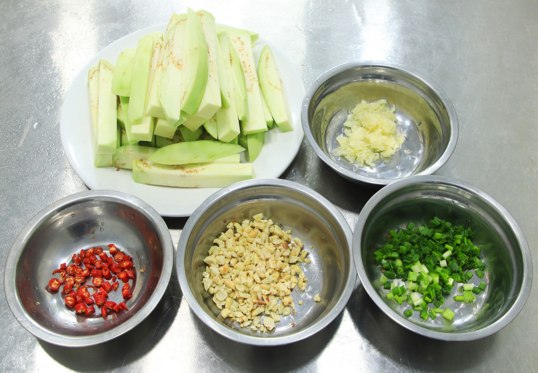 3.花生米炸好以后把青茄子削干净外皮,先切成厚片,再改刀切成长条放在盘中。把花生米剥去外皮,剥好以后用刀背压成花生碎放在盆中。