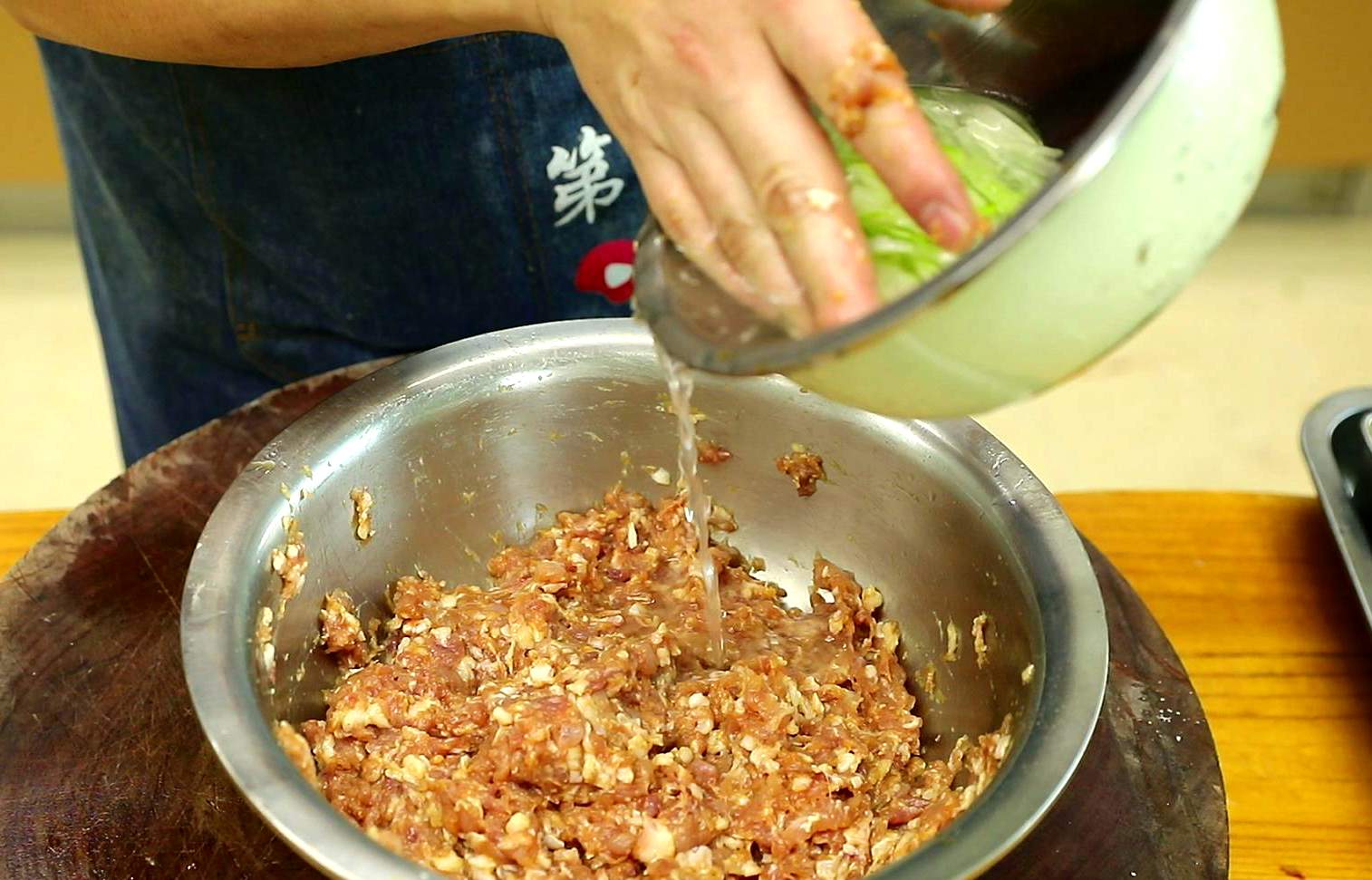 2.准备大葱、大姜都拍拍切碎,再加入食盐,用擀面杖锤出汁水,加入清水水泡上,然后分次往肉馅中倒葱姜水,每一次都要搅拌至完全吸收,再稍微淋点老抽、小磨香油,抓进去一把淀粉,继续搅拌摔打直至肉馅管拉丝,抓起来不掉落即可。