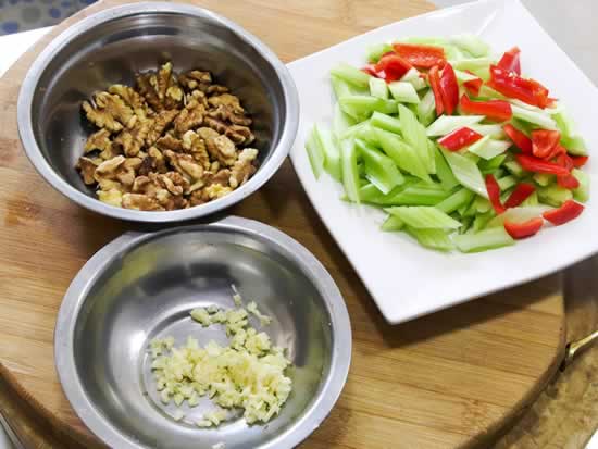 1.将一棵西芹掰散,扯去茎上的老筋,老筋影响口感且不易消化,放入清水中清洗干净后捞出,把芹菜从中间剖开,斜刀切成菱形片备用;半个红椒先切成条,再切成菱形片;核桃200克,把核桃仁剥出备用;几粒大蒜拍散后切成蒜末。