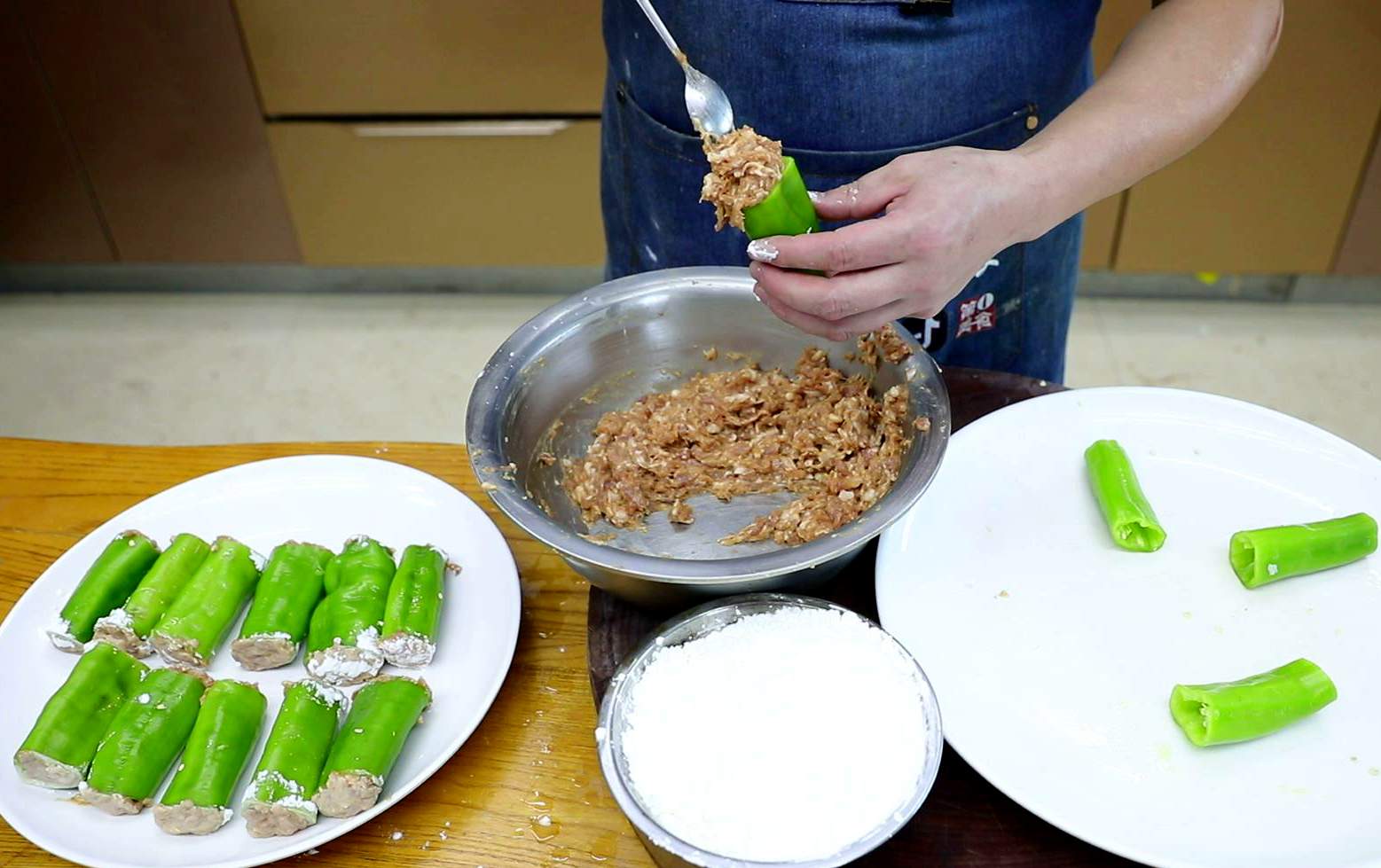 3.适量青椒去蒂,切成一样长的段,把里面的辣椒籽掏出来,然后往辣椒段中里塞肉馅,尽量塞满,以免炸好以后塌架,为了防止露馅,把两头都粘上淀粉;碗中加入葱段、姜片、一节桂皮、两片香叶、一块良姜、俩八角备用。