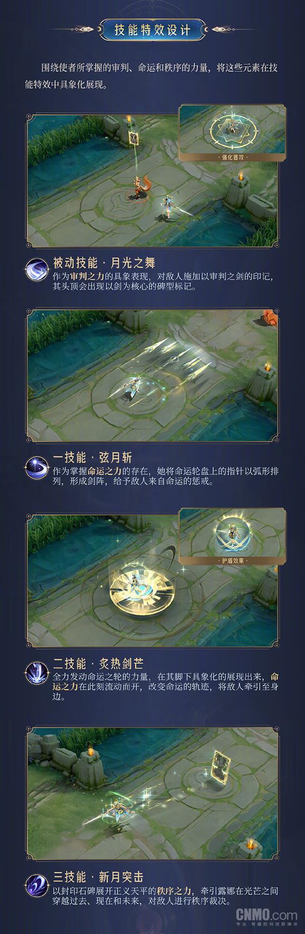 围绕使者所掌握审判、命运和秩序的力量,将这些元素在技能特效中具象化展现——被动技能表现审判之力,对敌人施加审判之剑的印记;一技能表现命运之力,将命运轮盘上的指针化作剑波,给予敌人来自命运的惩戒;二技能发动命运之轮,改变轨迹将敌人牵引至身边;三技能表现正义天平的秩序之力,可在时空之间飞跃,让敌人见识秩序的力量。