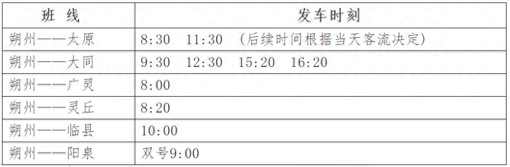 上表均为近期运营班线及发车时间,后续班线及车次时间将根据属地疫情防控办要求和当天客流情况决定,具体班线、班次、时间等信息均可通过“朔州汽车客运北站”微信公众号、“智行山西”小程序、车站售票窗口查询,或拨打服务热线0349-5998177进行咨询,感谢大家的支持和关注。
