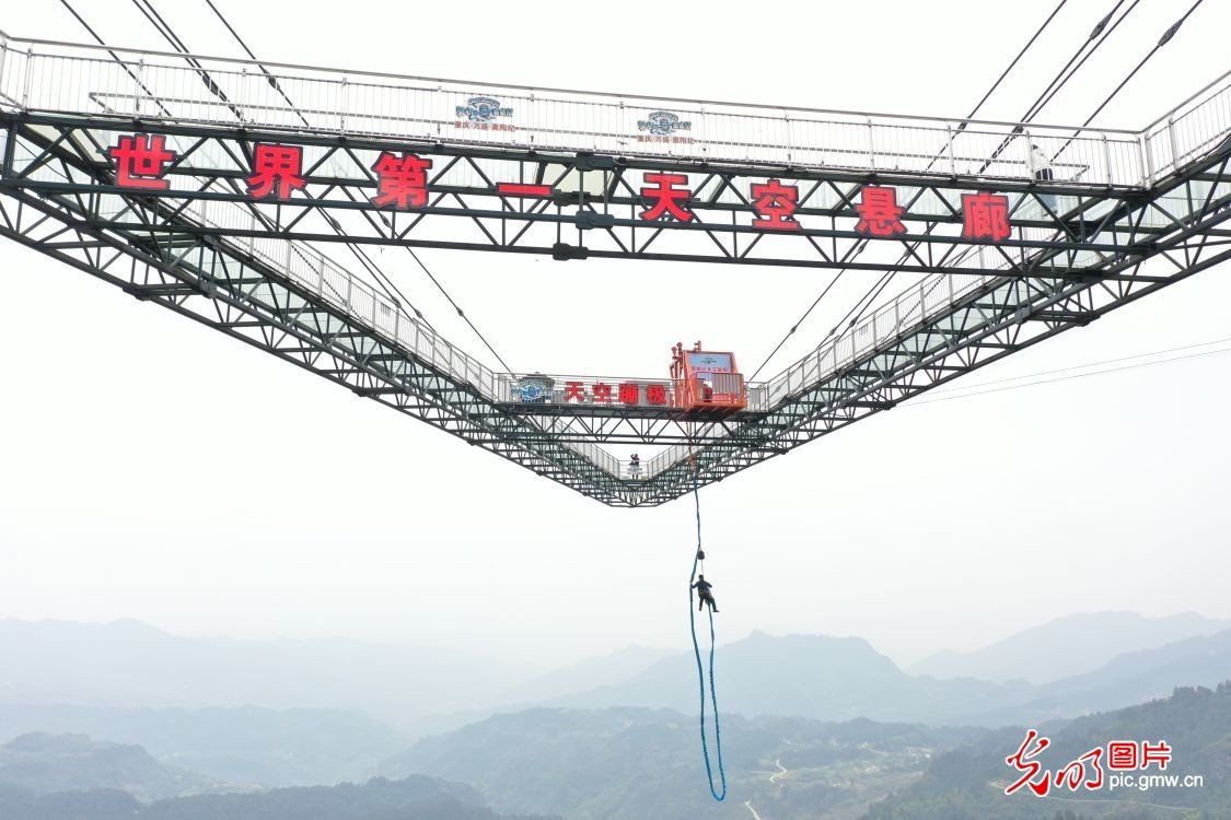 2023年3月22日,重庆万盛,游客在奥陶纪梦幻公园的体验“天空蹦极”。该公园位于万盛黑山之巅,规划面积12.57平方公里,拥有玻璃吊桥、火箭蹦极、大摆锤等38项悬崖高空项目。其中公园特色“天空悬廊”成“A”字形向外悬挑80米,它是奥陶纪独树一帜的原创悬崖美景。(光明网记者季春红摄/光明图片)
