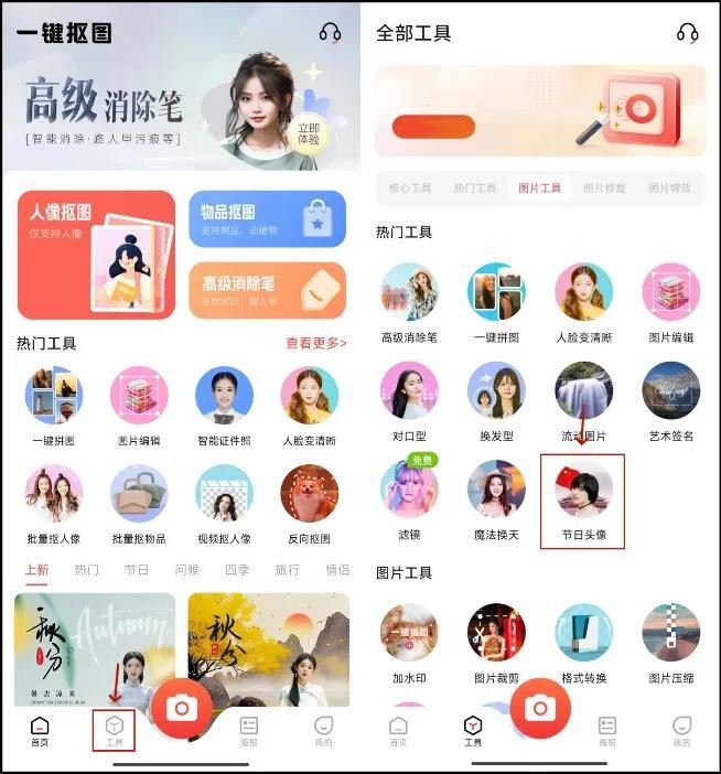 使用一键抠图APP制作国庆头像非常轻松,只需要打开APP,点击下方“工具”,找到热门工具下的“节日头像”功能;