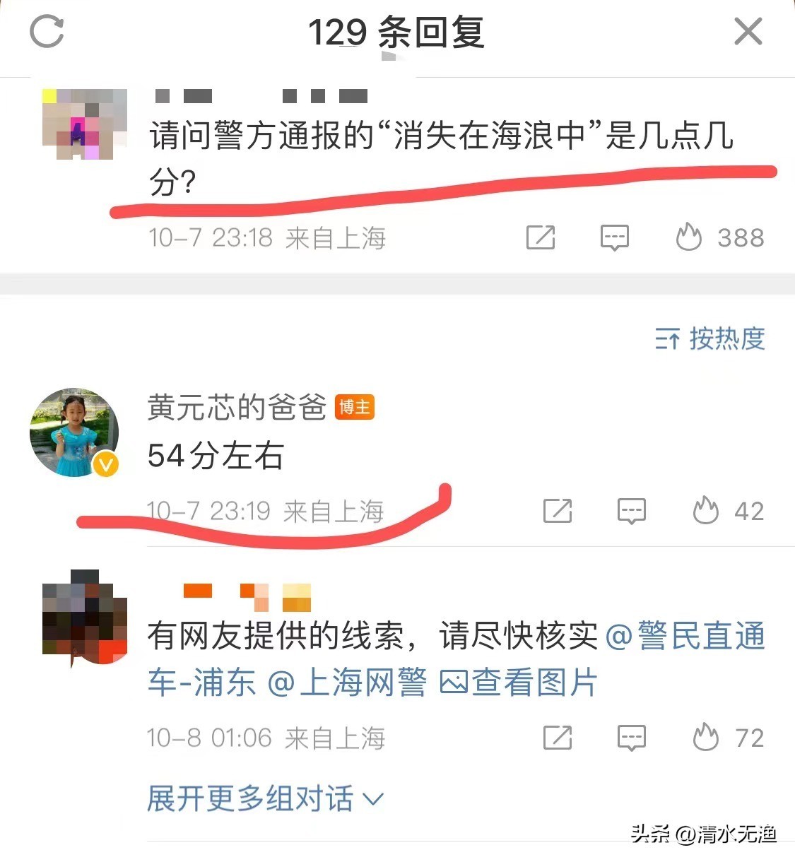 在孩子爸爸的这条消息下面,有网友提问,警方通报的“消失在海浪中”是几点几分,他马上进行了回复,是54分左右。
