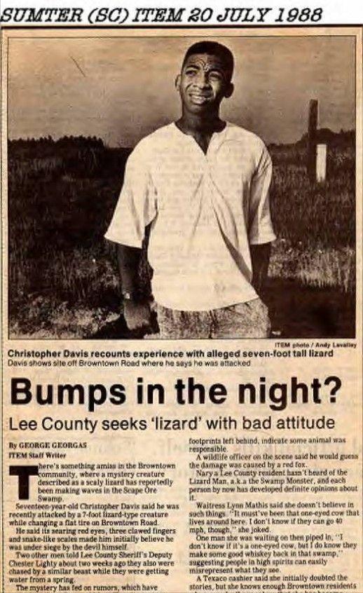 1988年6月29日下午,一位名叫达维斯的年轻人在驾车路过斯凯波·尤里沼泽时,据称不但见到了蜥蜴人,而且还和它有过近距离接触。