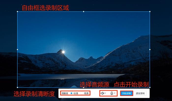 步骤2:自由框选录制区域,选择录屏清晰度、是否录制系统声音或麦克风声音。设置完成后,点击“开始录制”,录制完成后点击“结束录制”即可保存视频。