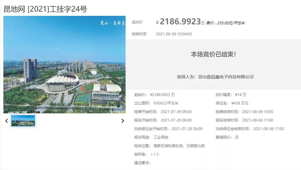 前不久,根据官方公示,昆山鼎昌鑫电子科技有限公司竞得昆山高新区瑞科路东侧、玉杨路北侧地块。
