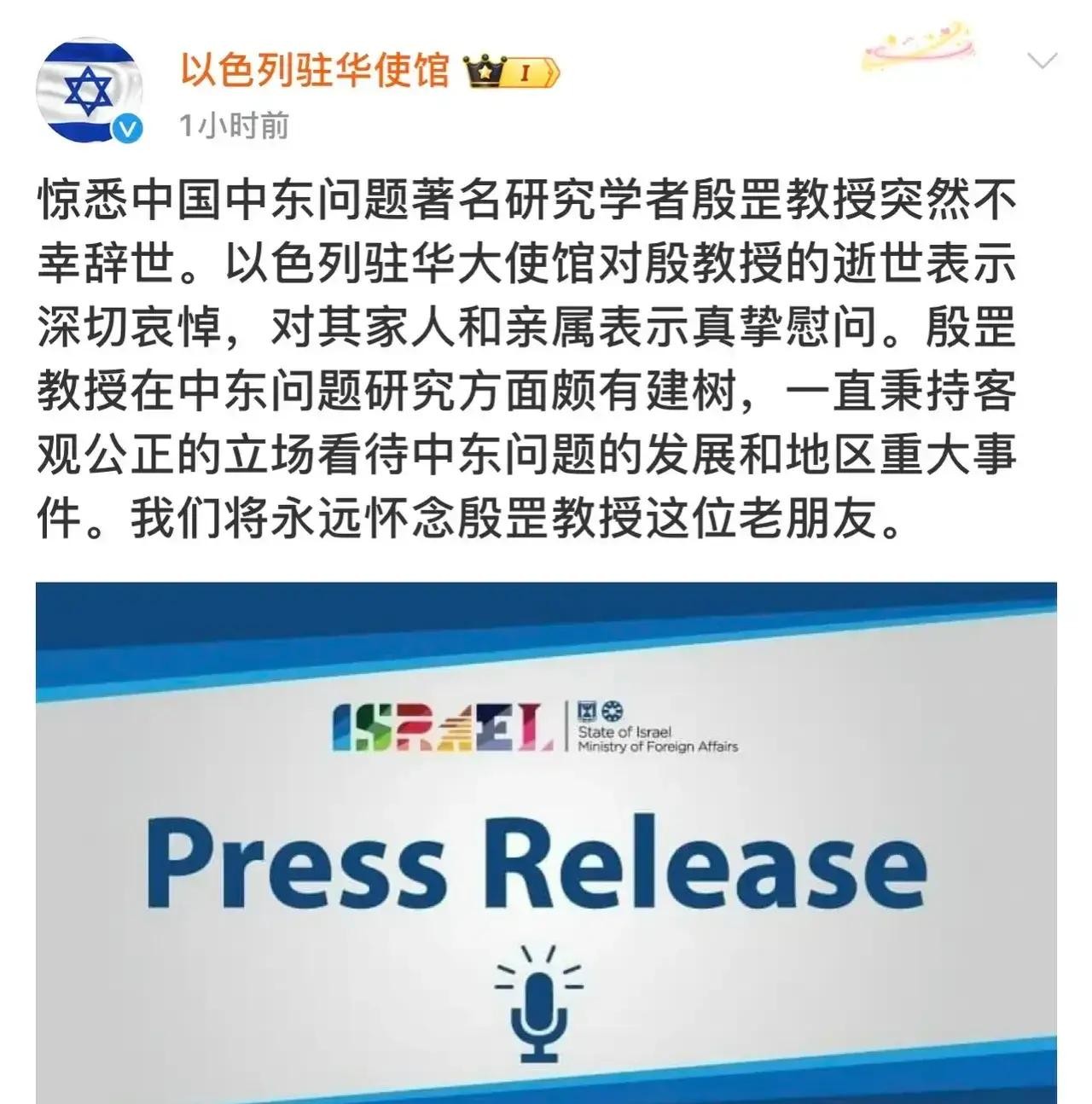 在他离世后,以色列驻华使馆对其进行了深刻的哀悼,既向殷罡的家人进行慰问,又夸赞了殷罡在中东问题上的建树。