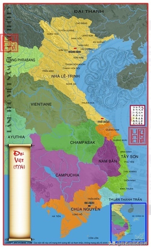 18世纪越南地图可看到阮氏军阀须面对西山起义、柬埔寨、占婆等外敌,北方还有后黎朝皇帝以及郑氏军阀的力量