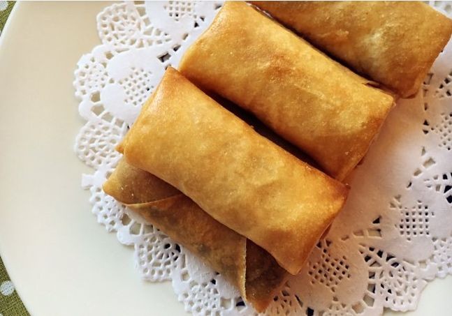 10.锅置旺火上,下菜油至七成热时,将包好的春卷放入油锅炸至金黄色,捞起装盆即成。