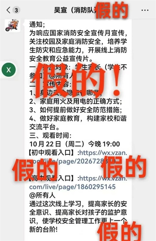 2024年10月22日,贵州安顺消防接到群众反映称:有不法分子冒充消防部门人员发送通知,他们通过微信联系各学校的主要负责人,并发送链接,声称要开展消防安全学习教育,好在群众心思新锐及时发现问题并举报核实,避免了一场骗局的上演。