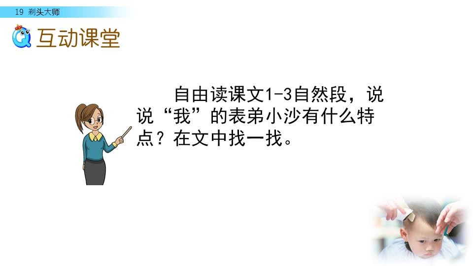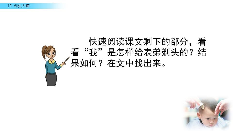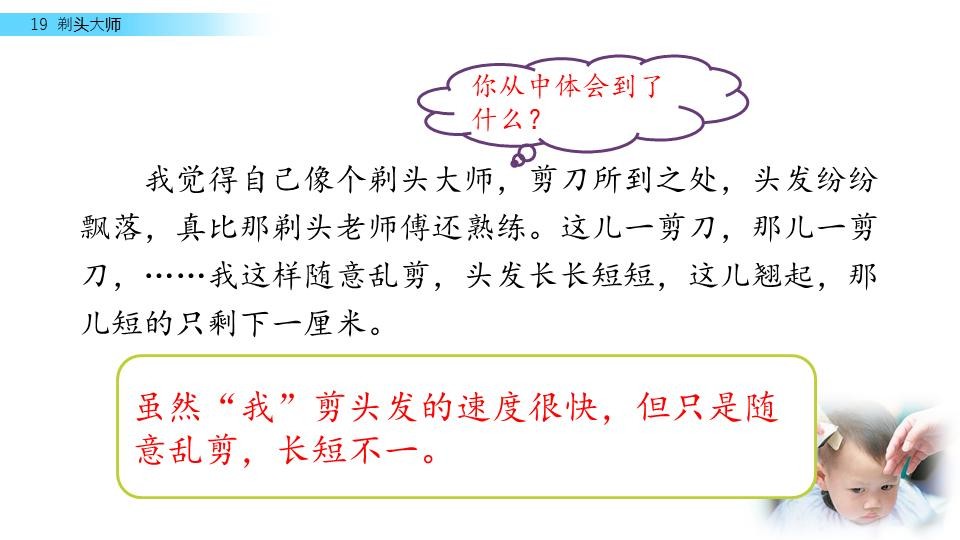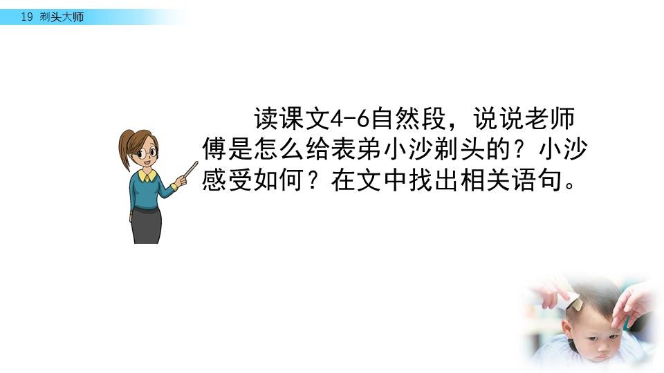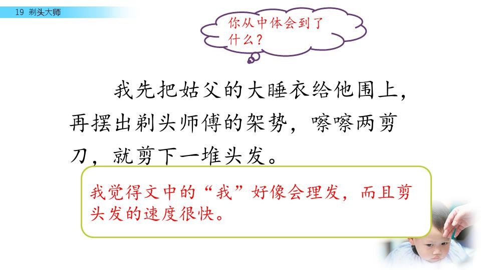同学们,你们喜欢理发吗?今天,我们来见识一位“剃头大师”,看看他是怎么给别人理发的。