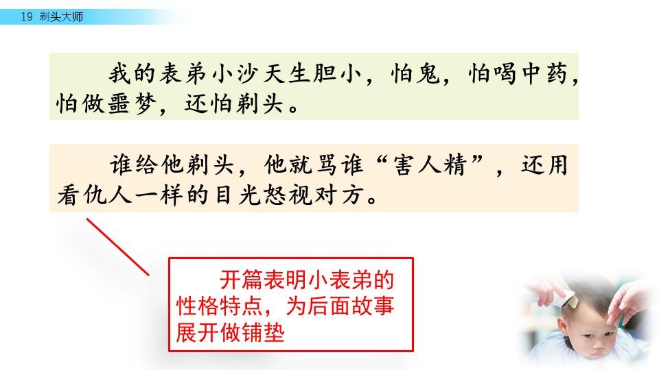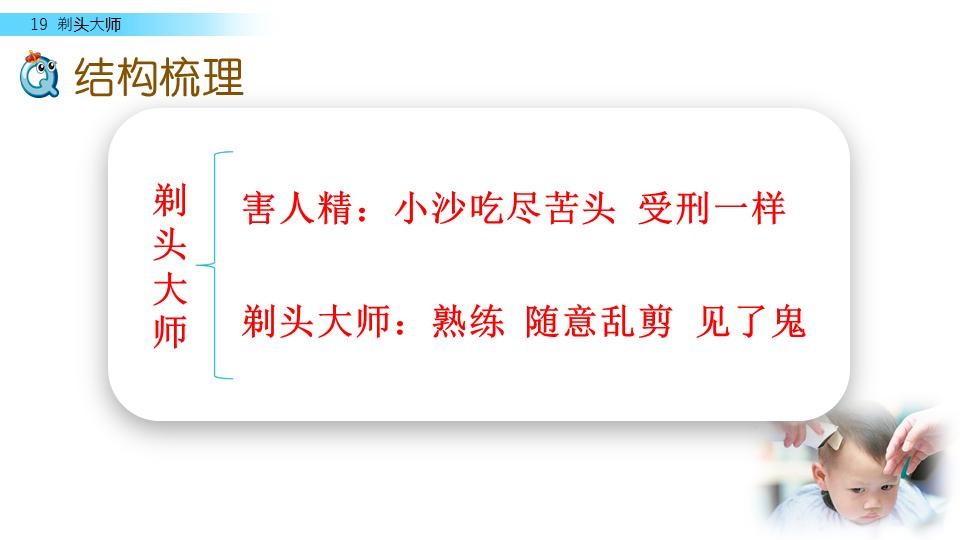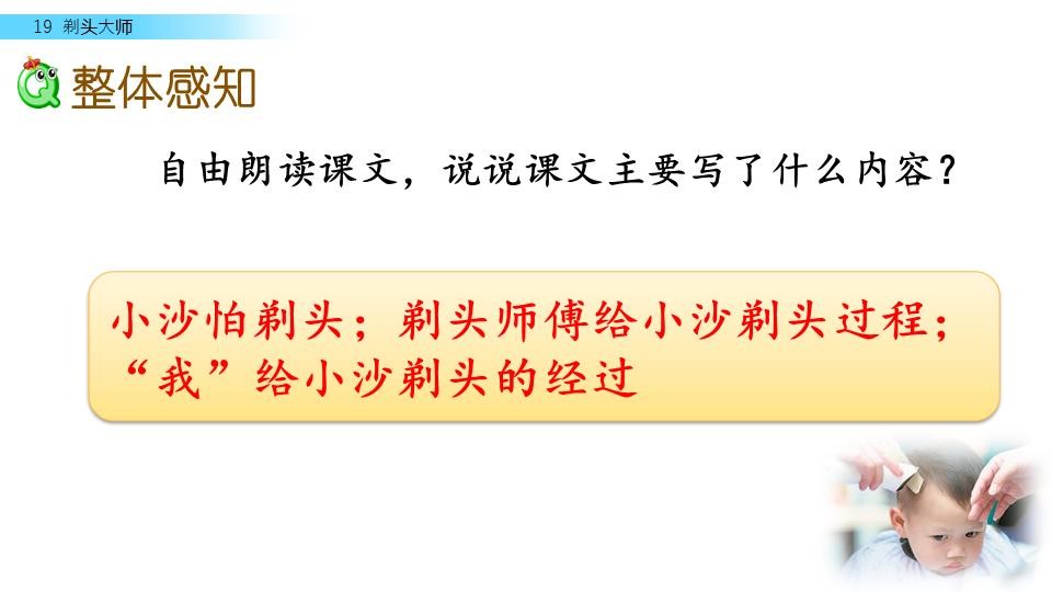 这篇课文写的是小沙怕剃头,刚开始是老剃头师傅给他剃头,由于推剪老、眼神差,所以小沙 吃尽了苦头,后来写“我” 给他剃头,结果小沙像见了鬼一样。