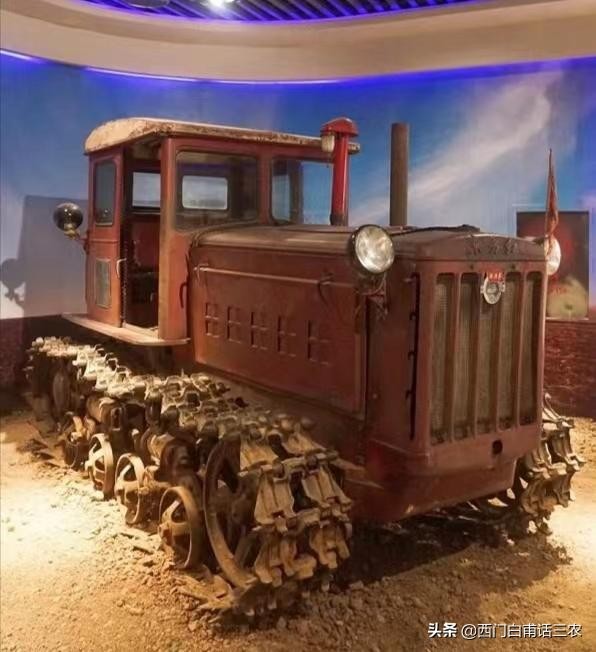 履带式拖拉机,就是它的“轮子”是履带式,而不是圆形的轮胎式。新中国成立后不久,我国工业还很落后,拖拉机还没有橡胶轮胎,用的是像坦克一样的履带,行动比较迟缓,据说就是用二战时的坦克改装的。然而,尽管它比较粗糙笨重,但在那个缺衣少食的年代里,东方红履带式拖拉机完成了全国机耕地60%的耕作任务,为农业生产力的提高做出了巨大贡献。