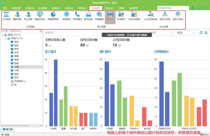 行为审计:电脑自开机后的所有操作将被详细记录下来,主要包括终端电脑打印文件、终端电脑进程名、USB使用、剪切板记录等。