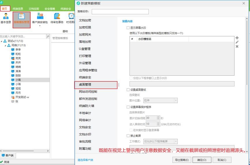 桌面管理:可以对所有员工桌面壁纸进行统一配置,也可以设置统一的屏保策略。为了防止拍照导致的信息泄露,也可以为员工的电脑屏幕添加透明水印。