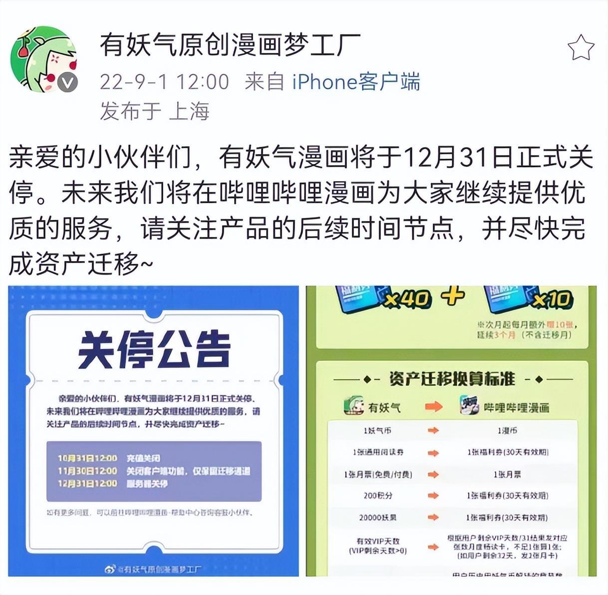 9月1日,有妖气漫画官方微博发布公告称,有妖气漫画于12月31日正式关停后,未来将在哔哩哔哩漫画继续提供服务。同时,公告提醒用户关注产品的后续时间节点,并尽快完成资产迁移。其中还提到,迁移完成后,妖气账户里妖气币、阅读券、月票、积分、妖果、有效VIP天数资产全部清零,会员皮肤失效;已购付费作品章节、付费封印图、付费卡牌依旧可以阅读和查看。