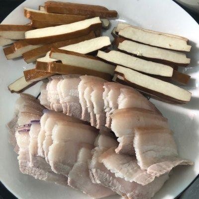 1、猪肉冷水下锅放料酒、生姜煮熟后捞出来等凉了切片,豆干切片。