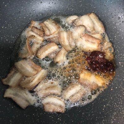 5、起锅烧热放少量油放入猪肉爆一下,我喜欢焦一点吃着没那么腻,看个人喜好。随后加入豆瓣白糖。