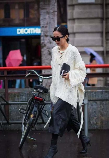 oversize的毛衣已经流行好几年了,但是今年同样还是很火热。大尺寸的设计给人一种慵懒抚媚的别样女人味。记得下半身要搭配紧身裤哦~