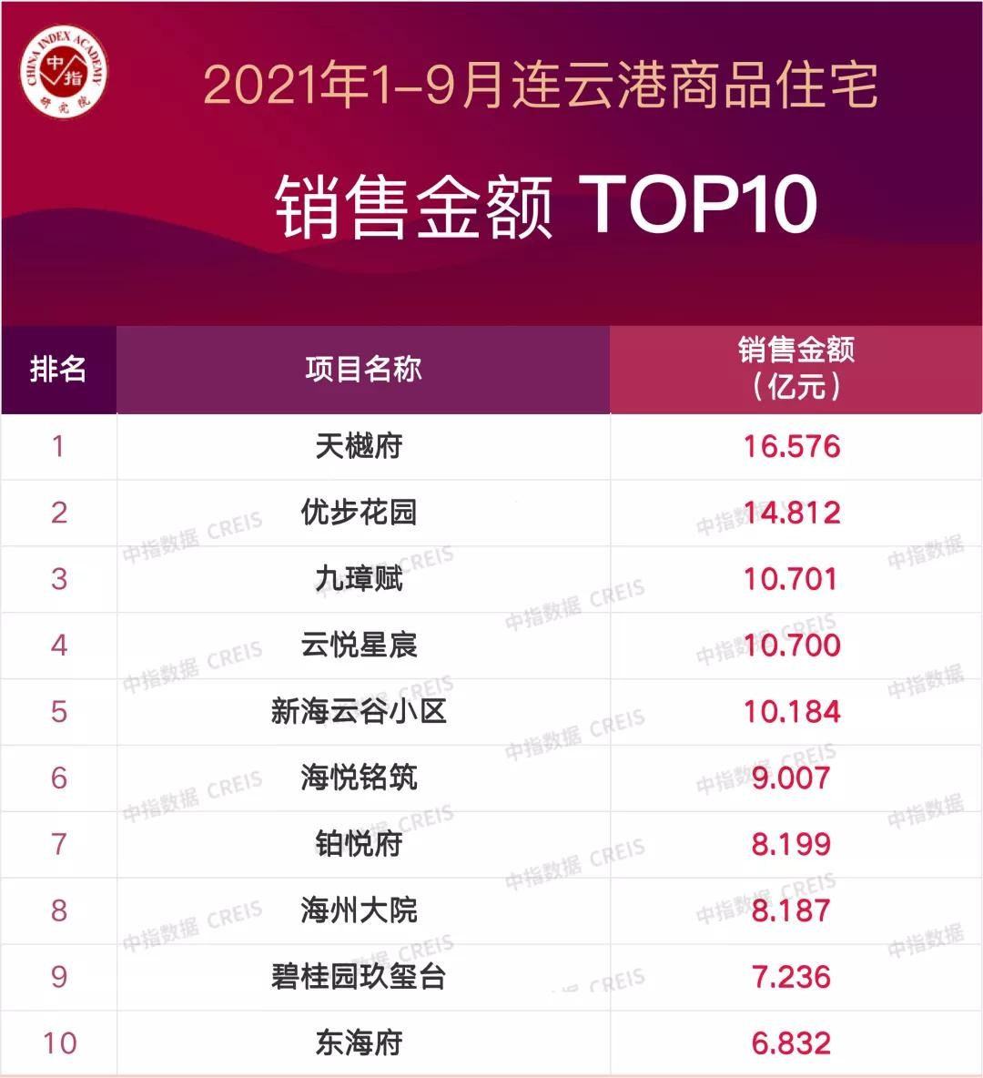 2021年1-9月,连云港商品住宅销售金额TOP10项目合计销售102.43亿元,同比增长50.55%。本次TOP10门槛值提升至6.832亿元。排行榜前5位的项目销售金额均超10亿元。其中第一名天樾府16.576亿元、第二名优步花园14.812亿元、第三名九璋赋10.701亿元。
