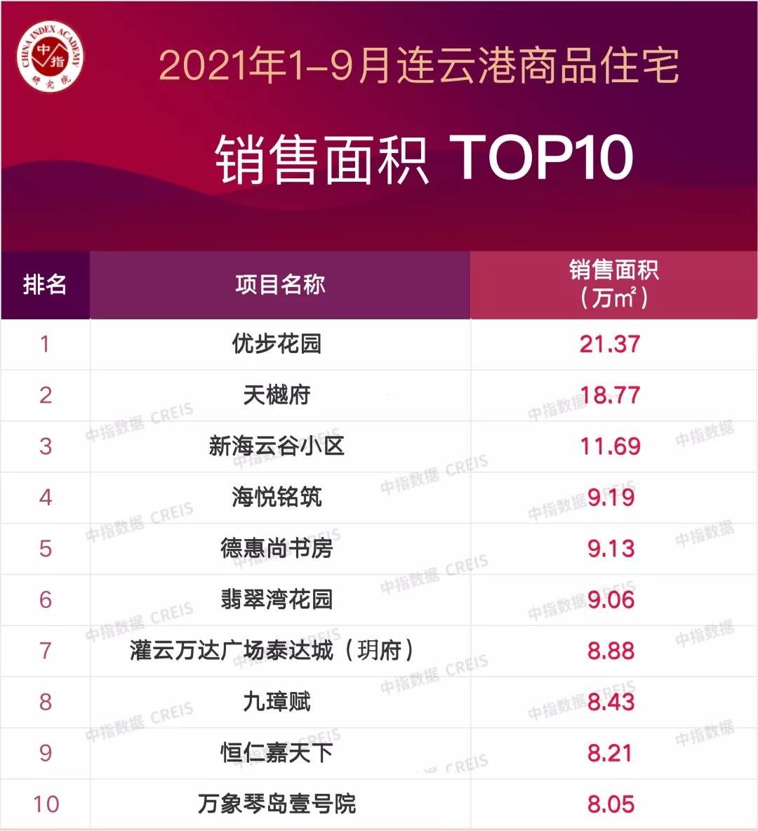 2021年1-9月,连云港商品住宅销售面积TOP10项目合计销售面积为112.78万平。其中,优步花园以21.37万平占据项目销售面积榜单的第一名,天樾府、新海云谷小区分别以18.77万平、11.69万平紧随其后,分列二、三名。