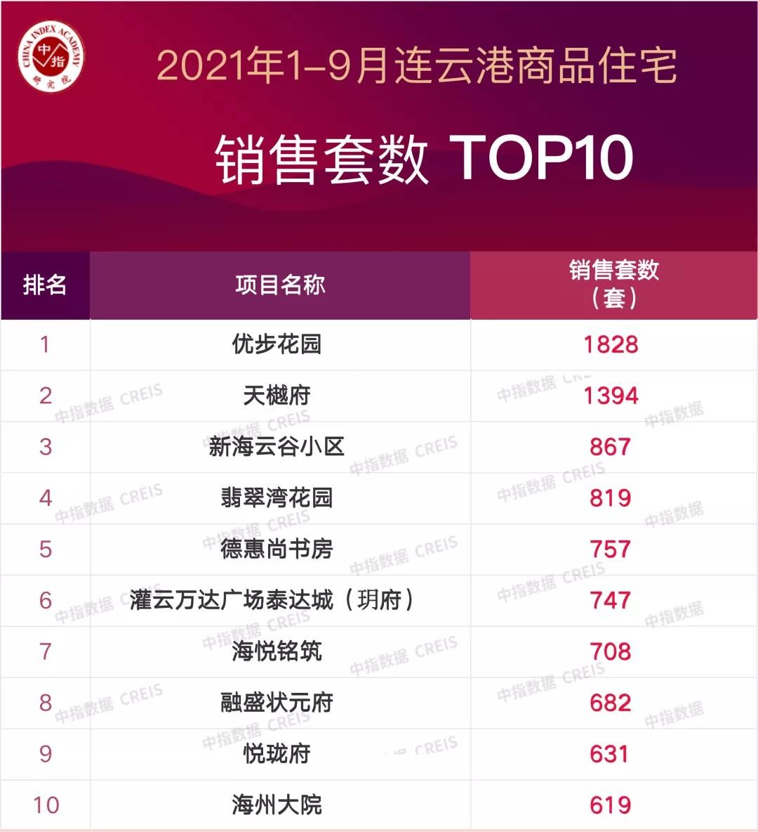 2021年1-9月,连云港商品住宅销售套数TOP10项目合计销售9052套。其中,优步花园以1828套占据项目销售套数榜单的第一名,天樾府、新海云谷小区分别以1394套、867套分列项目销售套数榜单的第二、第三名。