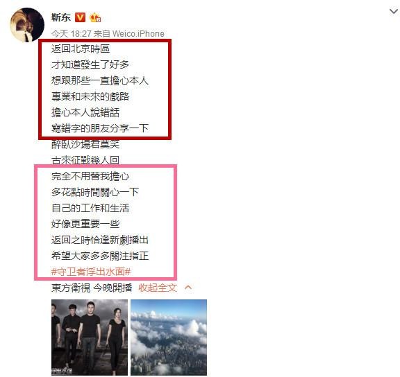 8月14日晚,靳东再次发博。今日回到北京的他才知道发生了很多,正式回怼了金星的批评以及说错话写错字的事件:不用为我戏路操心,多关心自己生活!