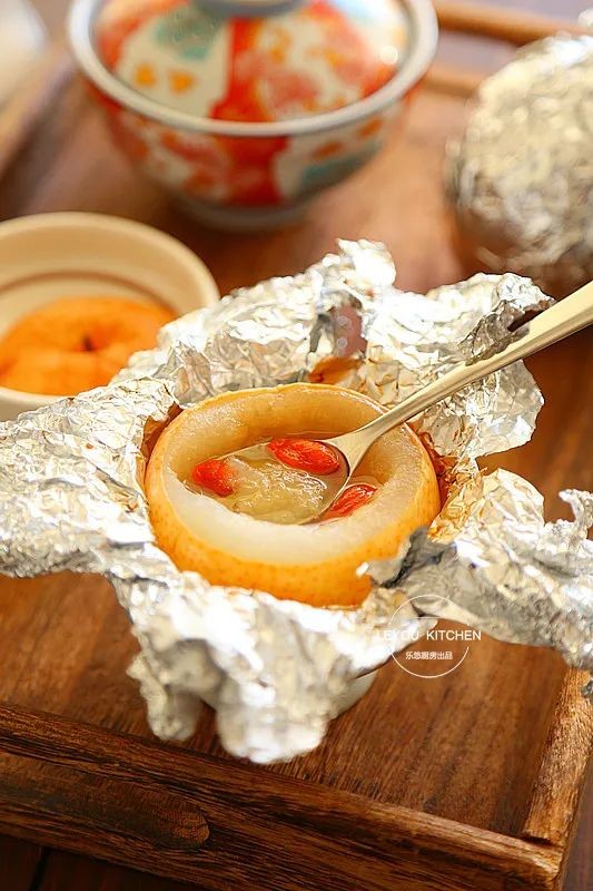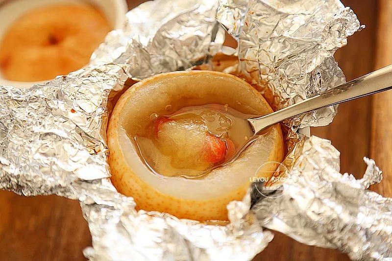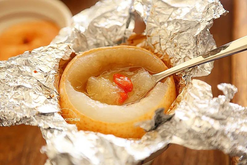 这个烤梨,做法超简单,不用开明火,把梨洗干净后挖掉核,放冰糖、枸杞,然后用锡纸包严实,放到烤箱或者空气炸锅中烤熟就可以了,也不用人看着,特别省事。