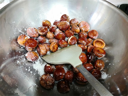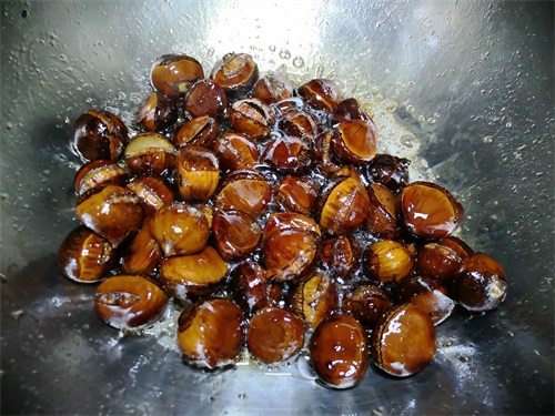 5、开锅后,接着中小火不停翻炒板栗,直至汤汁收干即可出锅。美美享用吧。