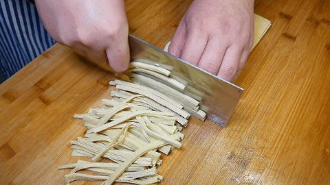 2.把切好的豆皮码放整齐,再把豆皮切成长条。