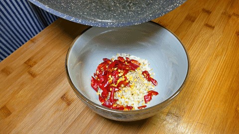 4.烧一些六成热的热油,把热油浇在红辣椒和蒜末上,用高油温激出香味。