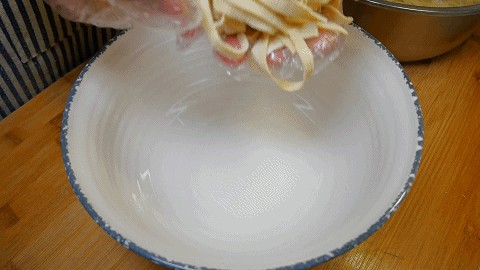 8.豆皮冷却后用力挤干水分放入盆中,豆皮中的水分越少,豆皮就越容易入味。