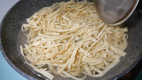 6.烧一锅开水,把豆皮下锅焯水一分钟,这样能去除豆腥味,豆皮的口感也变得更柔韧。