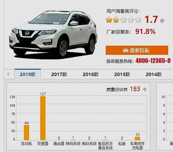 第三方平台显示奇骏的投诉量居高不下,变速箱投诉比例最大,客户满意度只有1.7分,非常低。