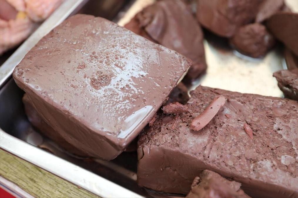 1、买一块猪血,猪血都是提前处理好的,已经定型了,不用自己回家弄,咱们直接冲洗一下,切片即可。